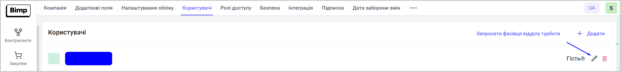 5. Далі переходимо у вкладку Користувачі, де кожного користувача відносимо до певної групи, раніше створеної у розділі Ролі доступу. Натискаємо на віджет "Редагувати" та вибираємо необхідний пункт.