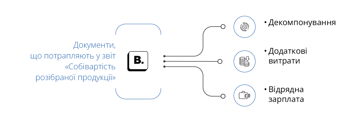 У звіт Собівартість розібраної продукції потрапляють, такі документи сервісу - "Виробництво", "Додаткові витрати".