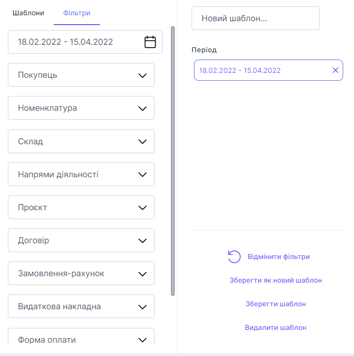 У випадку, коли потрібно часто використовувати одні й ті ж показники фільтрів у звіті, то можливо зберегти їх, як новий шаблон.