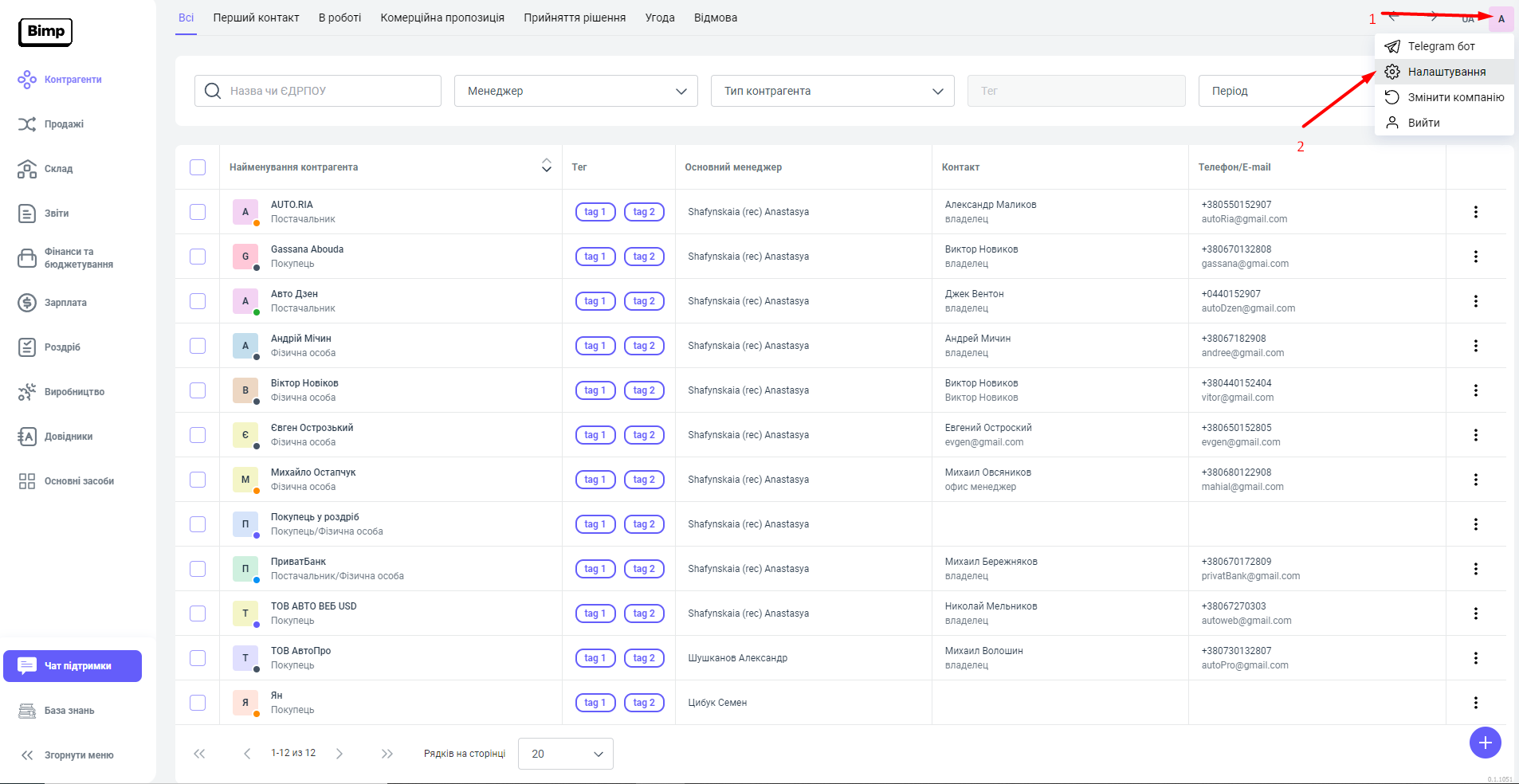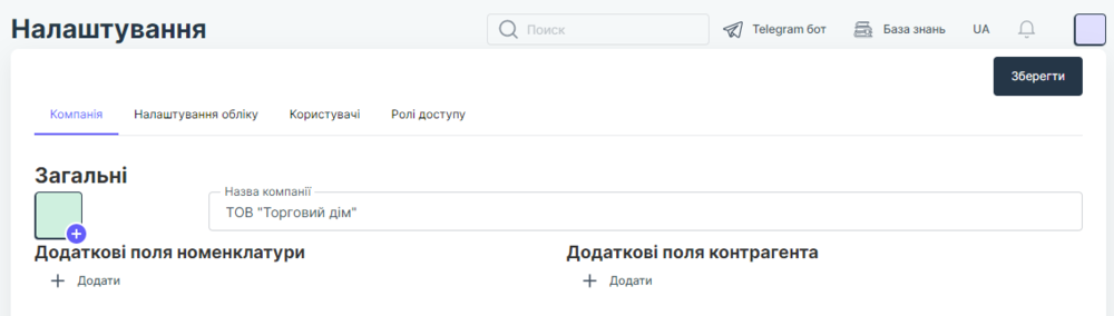 Для того, щоб змінити/додати інформацію про Вашу компанію, необхідно вибрати пункт Налаштування, що знаходиться верхнім правом куті. Натискаючи на кнопку , перед нами з'являється список, де необхідно обирати пункт Налаштування.