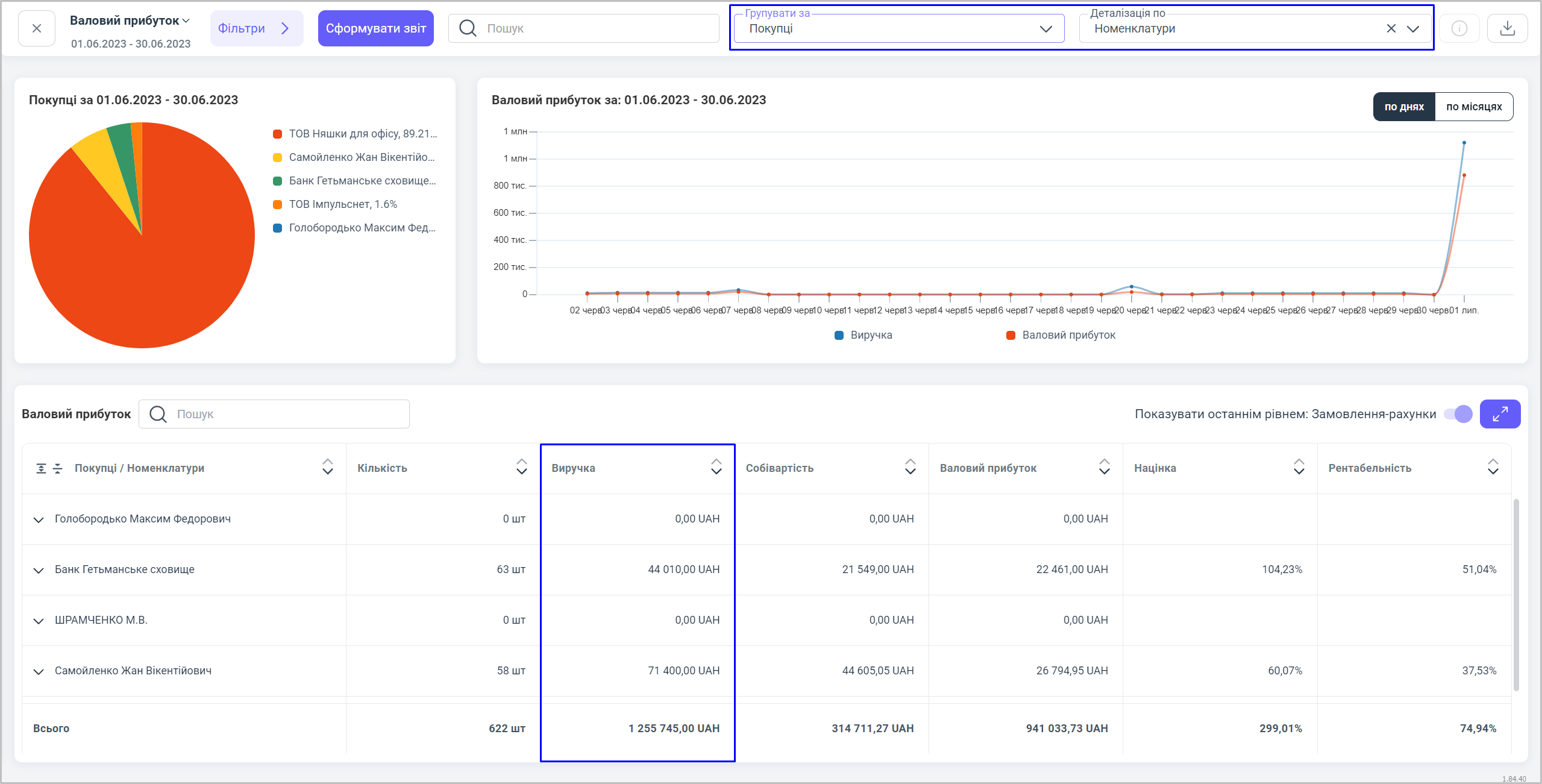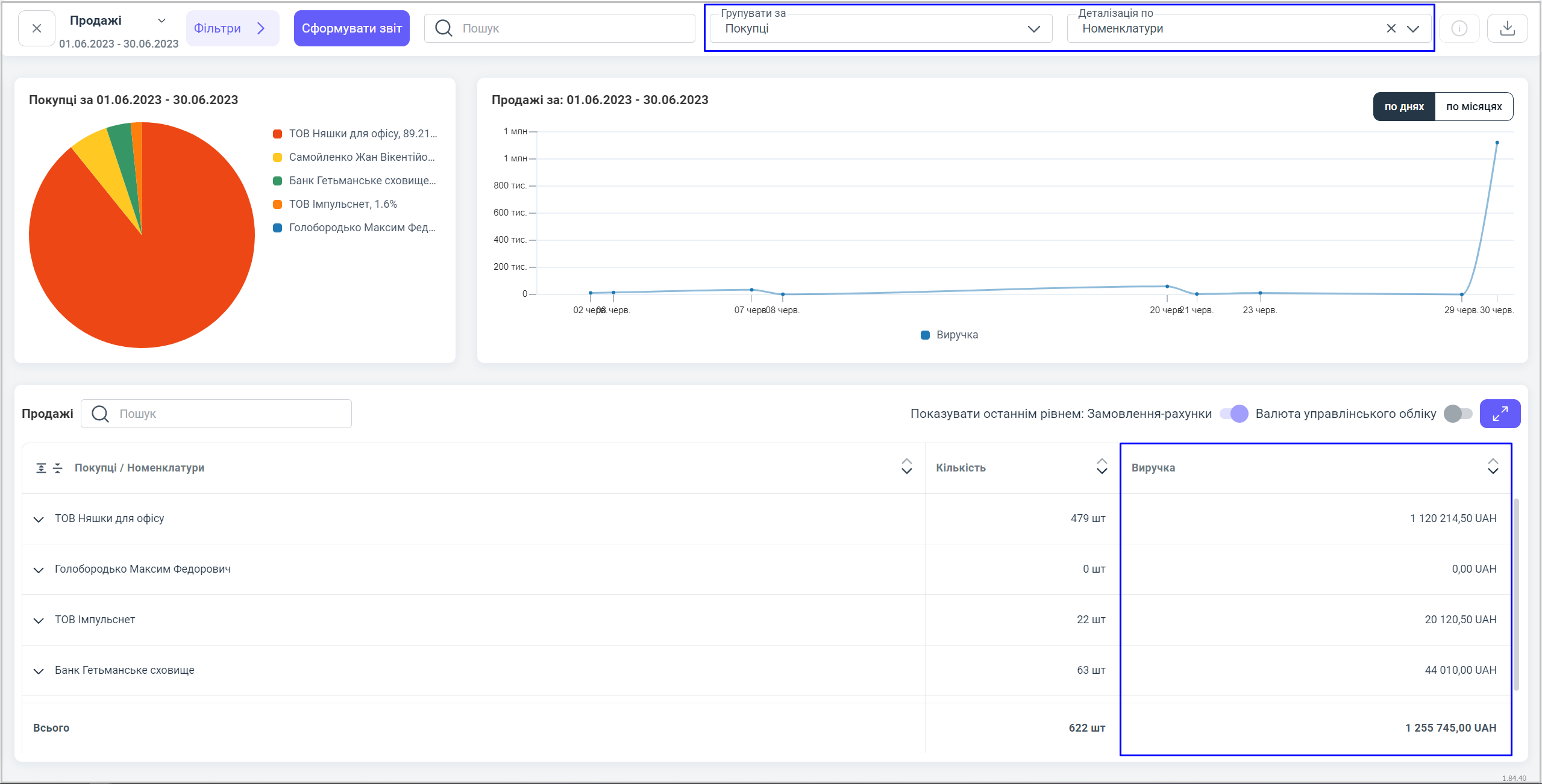 Також ми можемо побачити виручку за проданий товар по кожному напрямку діяльності компанії за допомогою звіту Продажі.