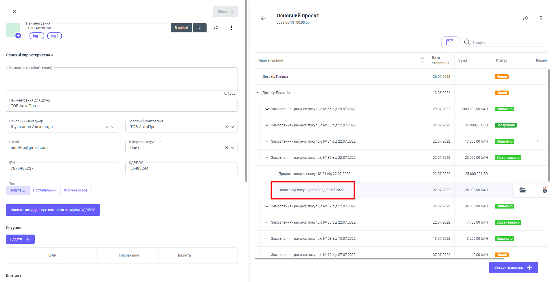 Перший спосіб, через блок Контрагенти - розділ Контрагент (покупець, яким необхідно оформити повернення) - Проект - Рахунок на оплату - Продаж товарів, послуг - Оплата від покупця.