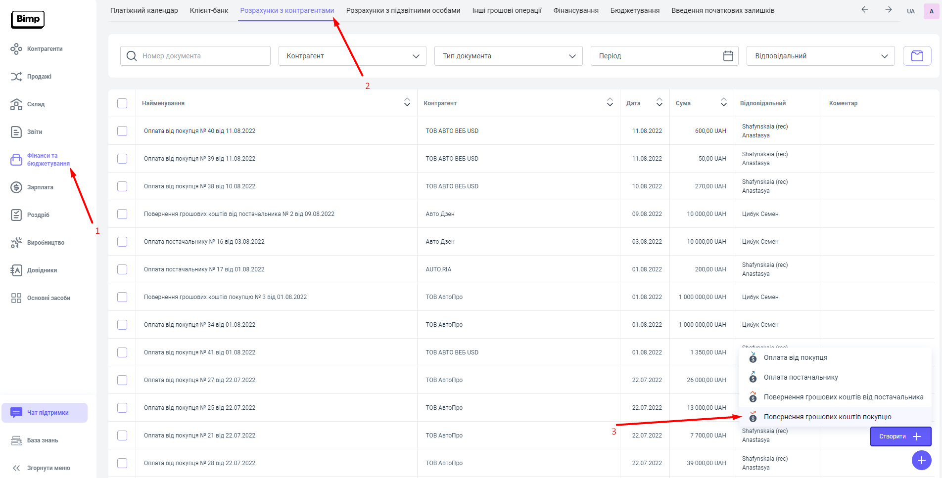 5. Оформити повернення коштів покупцю можливо двома способами: перший – через блок Контрагенти, розділ Контрагент, другий спосіб – через блок Фінанси та бюджетування, розділ Розрахунки з контрагентами.