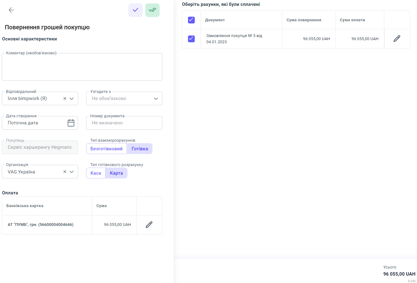- Зліва Дата створення (вказуємо дату, коли хочемо зробити повернення покупцю грошових коштів), Покупець (вказуємо контрагента зі списку, якому хочемо повернути кошти), Тип взаєморозрахунків (готівковий або безготівковий). А також, вказуємо з якого рахунку хочемо списати кошти для повернення покупцю