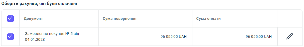- Справа робоче поле документа має такий вид для заповнення: Документ - стовпець, де Ви вказуєте на основі якого документа Ви хочете зробити повернення коштів), Сума повернення - стовпець, де Ви вказуєте, яку суму необхідно повернути покупцеві, Сума оплати - стовпець, де зазначається загальна сума оплати.