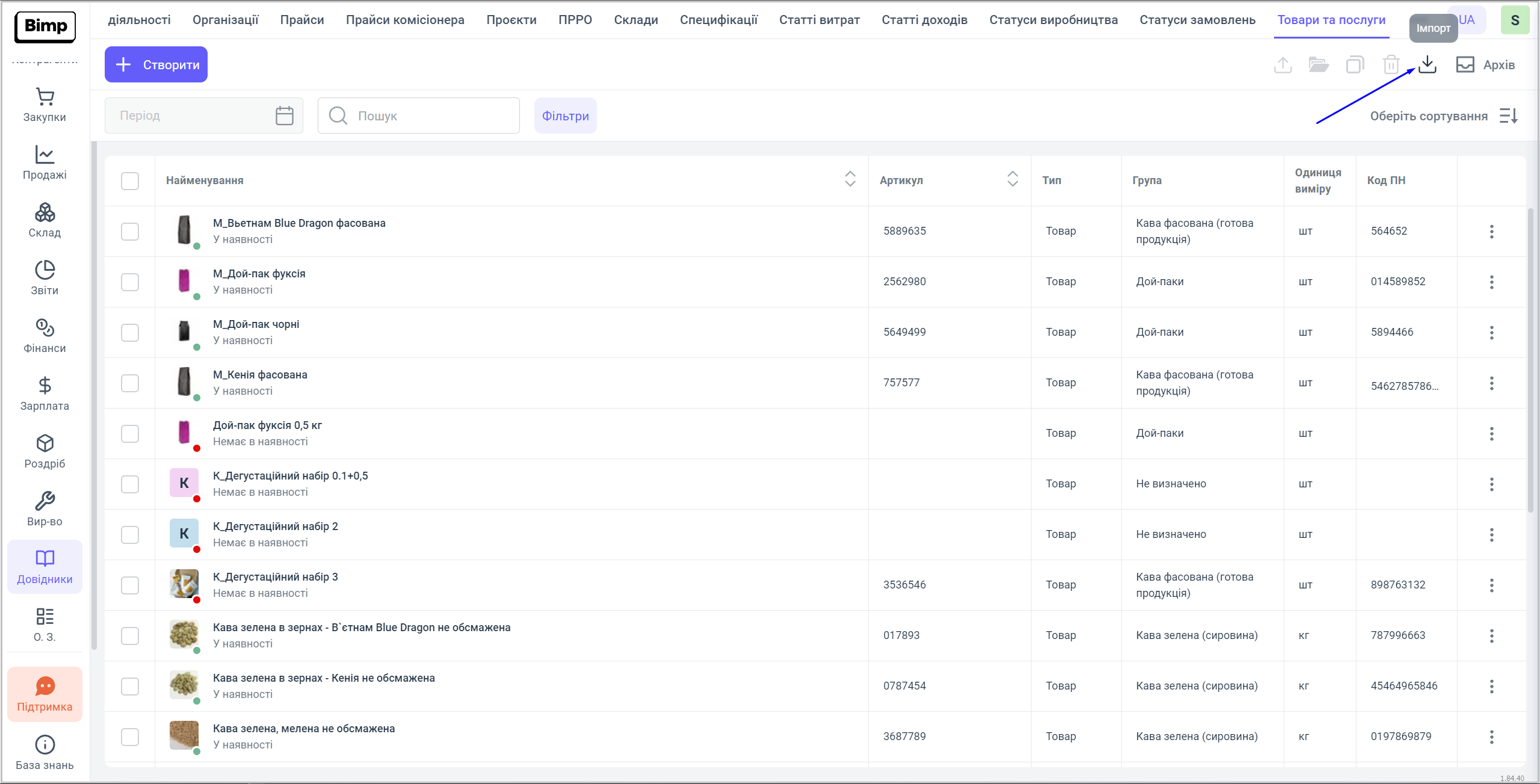 Після заповнення шаблону, необхідно зайти у свій обліковий запис на сервісі Bimp, перейти в блок Довідники розділ Товари та послуги, і натиснути на кнопку "Імпорт".