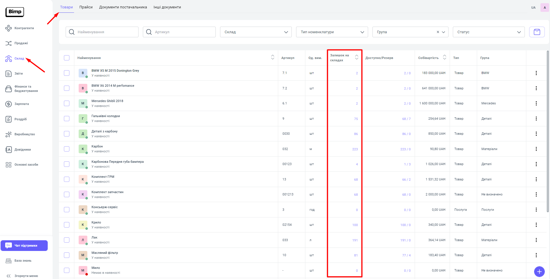 Для того, щоб подивитися залишки по складах необхідно перейти в блок Склад, розділ Товари. У стовпці "Залишок за складами" бачимо загальну кількість товару за складами.