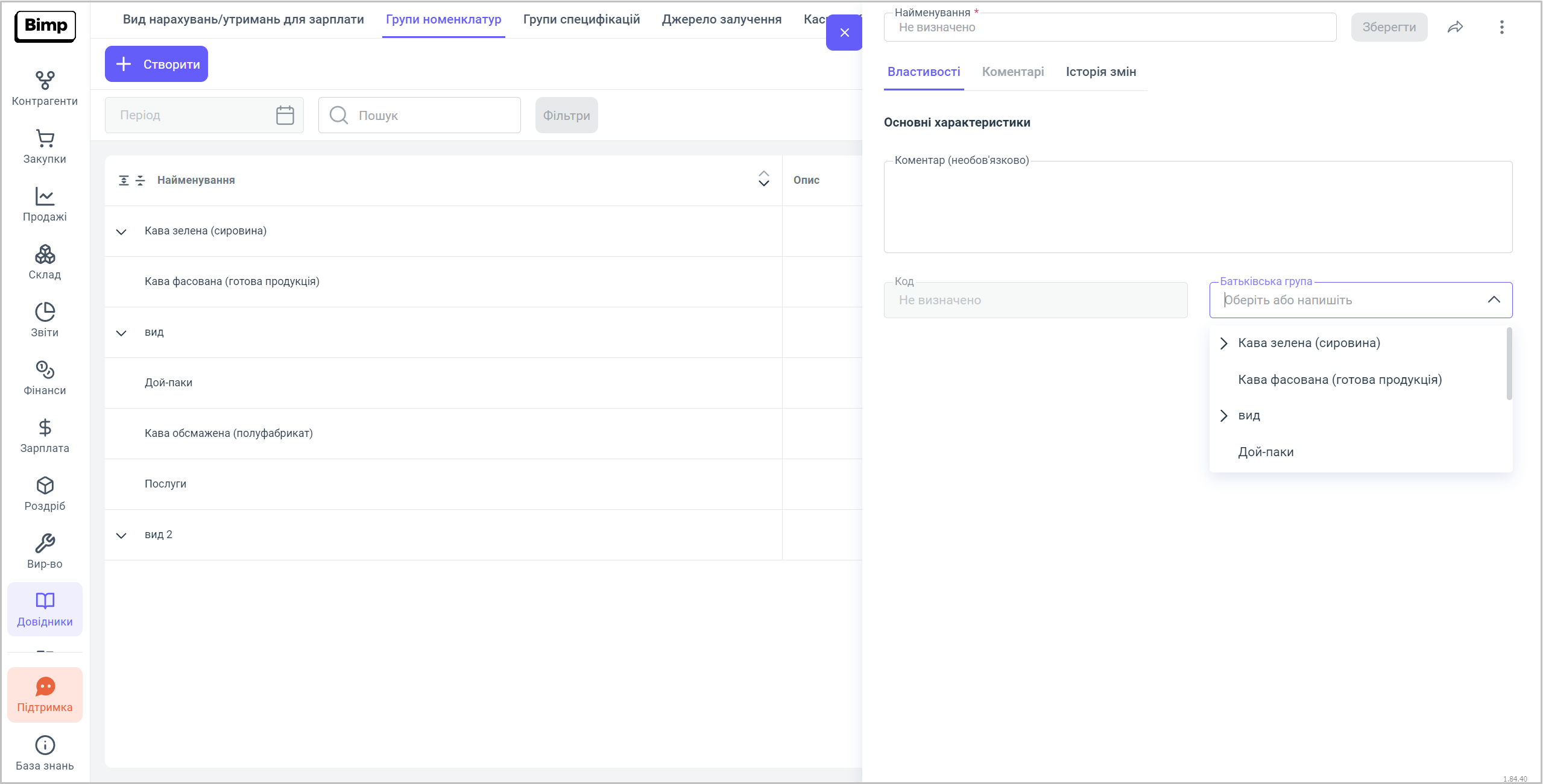 У полі Основні характеристики у рядку Коментар (необов'язково) - можливо внести дані про те, які номенклатури належать до даної групи, або іншу необхідну вашій компанії інформацію.