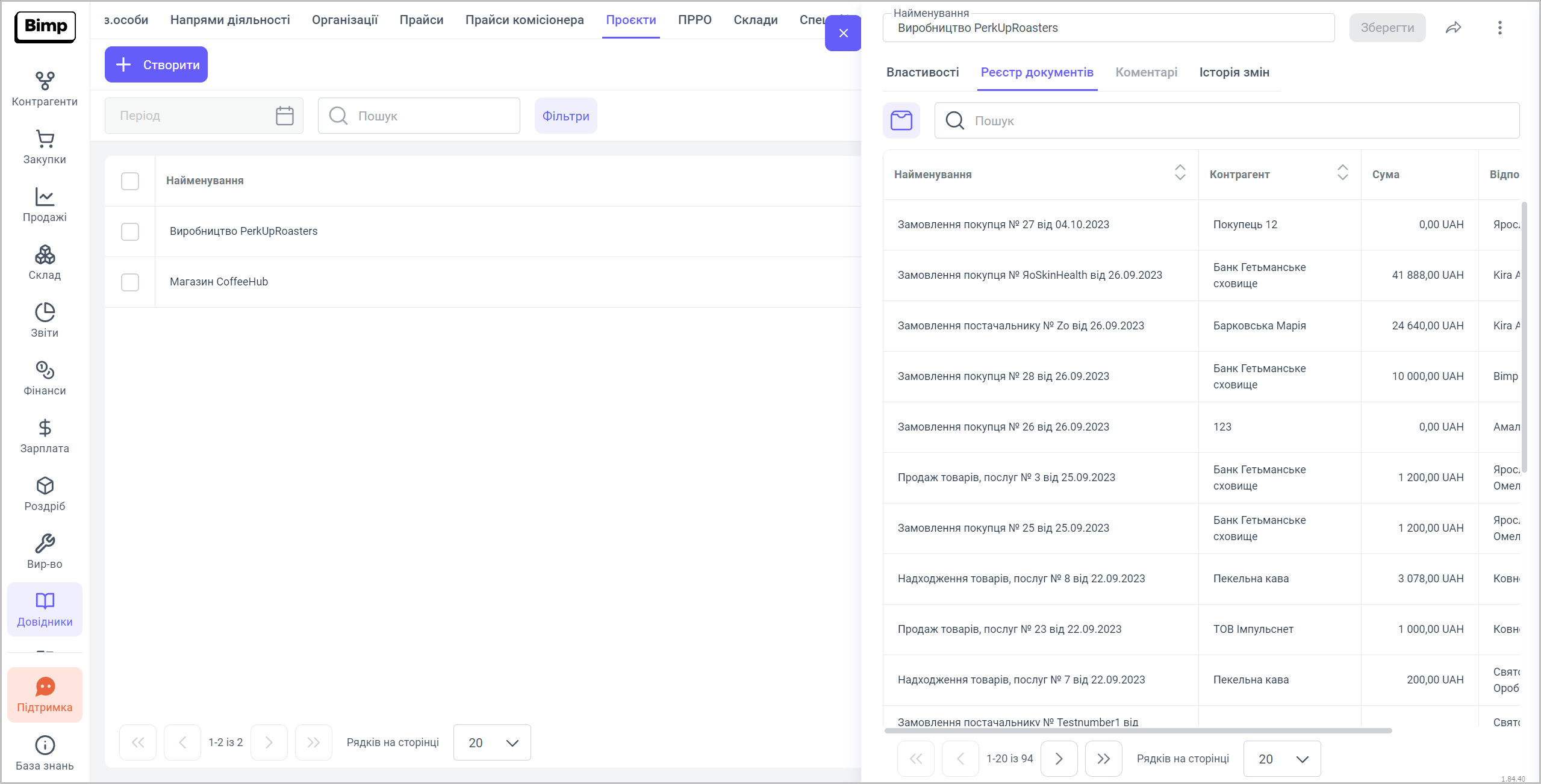 Вкладка Реєстр документів – необхідна для відображення переліку всіх Договорів та документів проведених на їх основі, які були створені між вашою компанією та вашими контрагентами. Цей розділ з'явиться після створення проєкту та повторного переходу у картку проєкту.