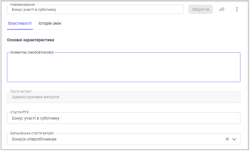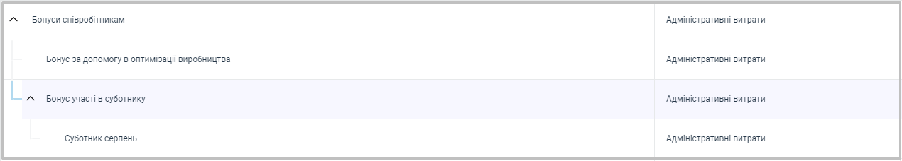 Архітектура довідника Статей витрат дозволяє створити ієрархію статей витрат. Для прикладу, створимо ієрархію витрат на участь у виставках. Розберемо цей процес покроково на прикладі витрат на виставку "Бонус участі в суботнику".