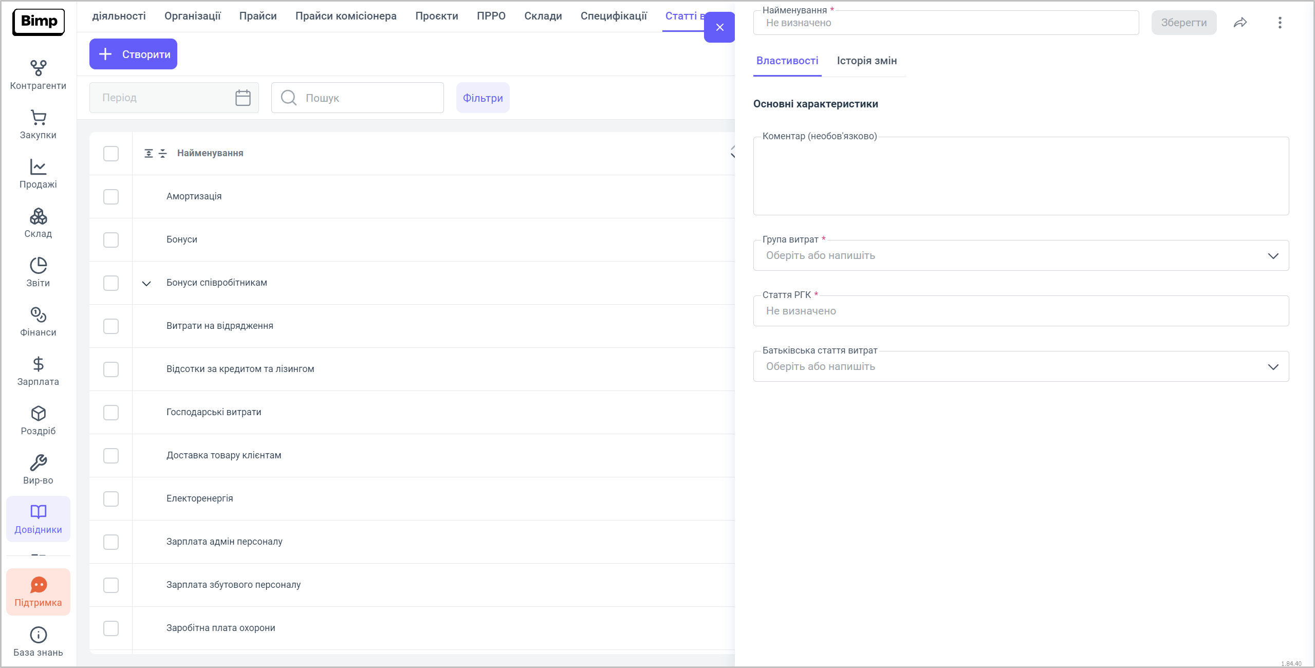 Статті витрат можна внести вручну. Для цього необхідно відкрити блок Довідники, розділ Статті витрат та натискаємо на кнопку “Створити” на робочому полі довідника.​
