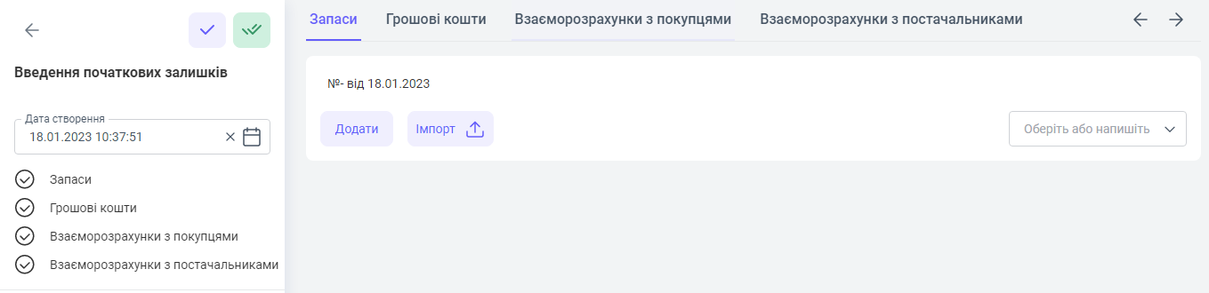 Рядок Дата створення — за замовчуванням, програма виставляє дату та час, які були під час відкриття документа. Цією датою програма і внесе ваші залишки безготівкових коштів на розрахункові рахунки компанії.