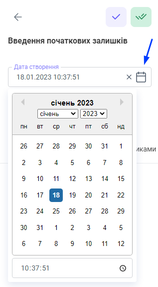 Якщо, ви хочете змінити час або дату внесення залишків безготівкових коштів на розрахункові рахунки, ви можете самостійно вписати цю дату - вручну, або за допомогою віджету , обрати дату з календаря.