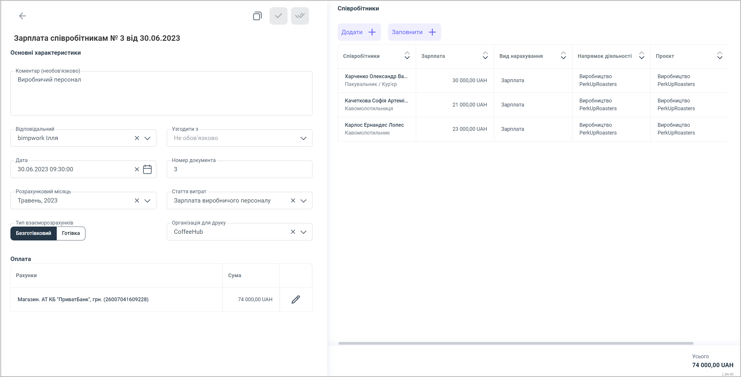 У стовпці Зарплата вписуємо суму, яку необхідно виплатити даному співробітнику. У стовпці Напрямок діяльності та Проєкт вибираємо зі списку варіантів необхідні.