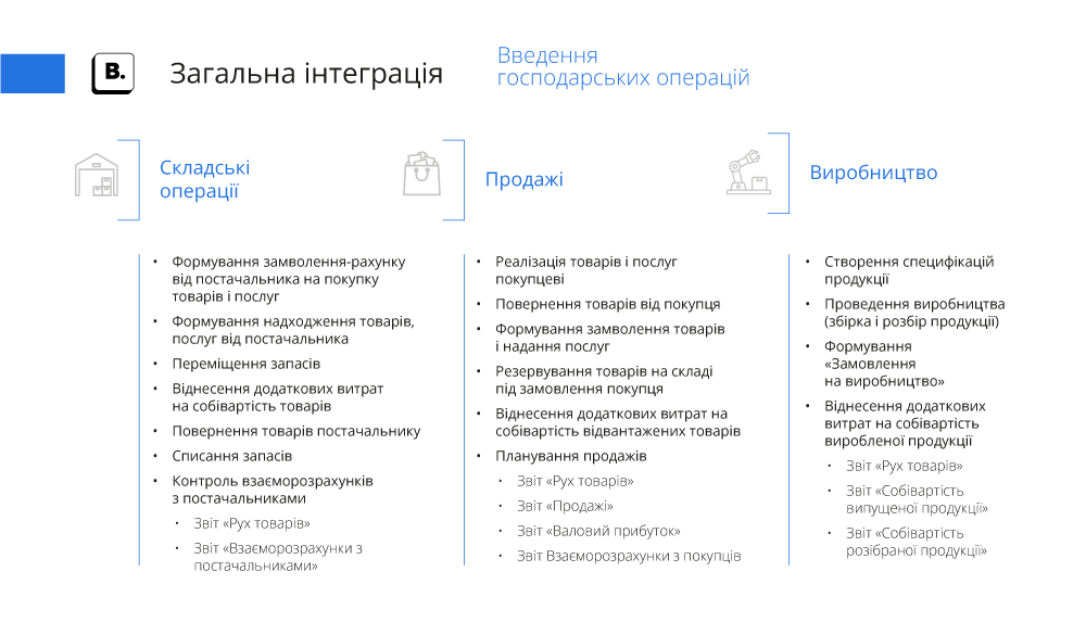 - Звіт "Рух товарів", Звіт "Собівартість випущеної продукції", Звіт "Собівартість розібраної продукції".