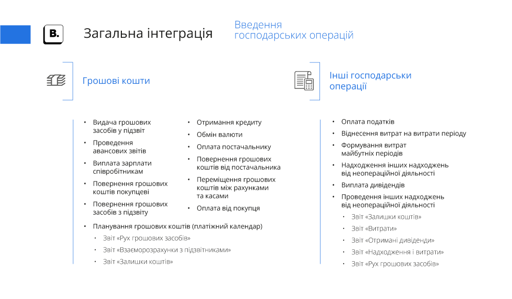 - Звіт "Залишок коштів", Звіт "Витрати", Звіт "Отримані дивіденди", Звіт "Доходи та витрати", Звіт "Рух грошових коштів".