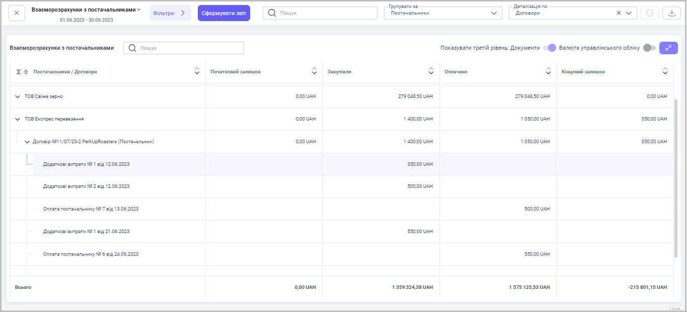 Після збільшення собівартості товару, що надійшов на склад компанії, у звіті ми можемо побачити за яким контрагентом і на яку суму сталася додаткова витрата, а також на який саме товар, що надійшов, це було зроблено.