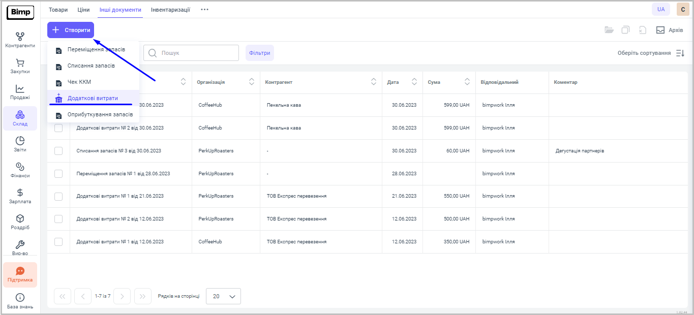 II - ви можете створити цей документ через блок Склад розділ Інші документи, натиснувши кнопку "+ Створити" та вибрати зі списку рядок Додаткові витрати.