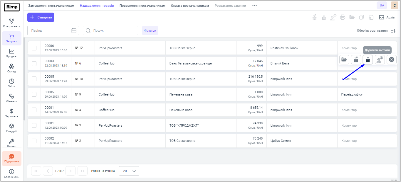 У сервісі Bimp, щоб оформити додаткові витрати на надходження товарів необхідно скористатися документом "Додаткові витрати".
