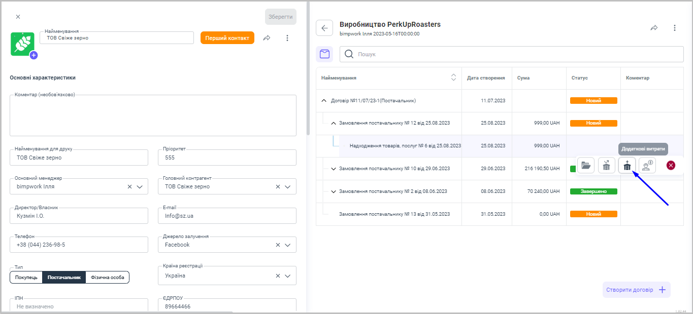 I - Документ "Додаткові витрати" ви можете створити в блоці Контрагенти, вибравши картку необхідного контрагента з типом — постачальник.