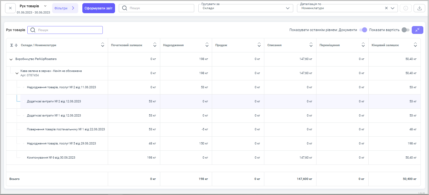 А також, дані з документа потрапляють у звіт — Рух товарів.