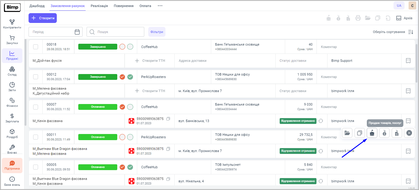 На сервісі Bimp для того, щоб продати товар зі складу компанії, спочатку потрібно створити документ "Замовлення покупця" і вже на його основі документ "Продаж товарів, послуг" = реалізувати товар зі складу.