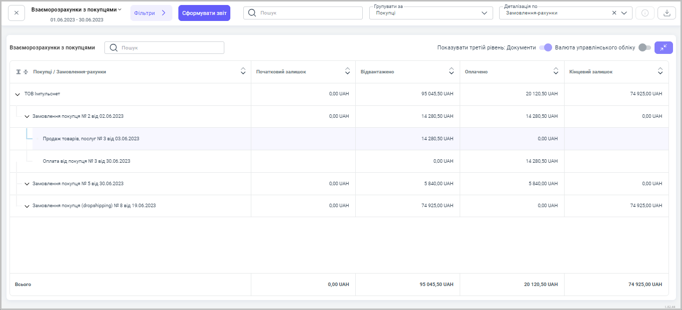 Після проведення на основі рахунку продажу товару зі складу компанії, у звіті ми можемо побачити, за яким контрагентом і на яку суму було реалізовано товар, а також можемо відстежувати нашу дебіторську заборгованість по кожному покупцю.