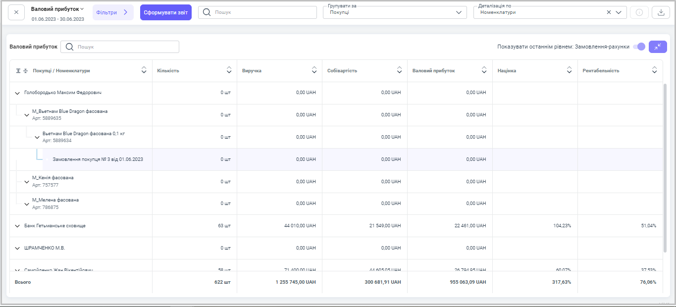 Після проведення на основі рахунку реалізації товару зі складу компанії у звіті ми можемо побачити, за яким замовленням і яка номенклатура була продана, в якій кількості та її собівартість, а також суму виручки за даний товар, націнку та рентабельність за конкретним рахунком.