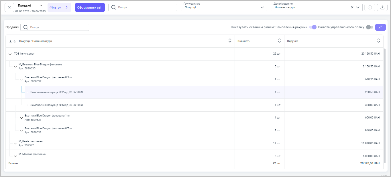 Після проведення на основі рахунку реалізації товару зі складу компанії, у звіті ми можемо побачити за яким замовленням і яка номенклатура була продана, в якій кількості, а також суму виручки за даний товар.