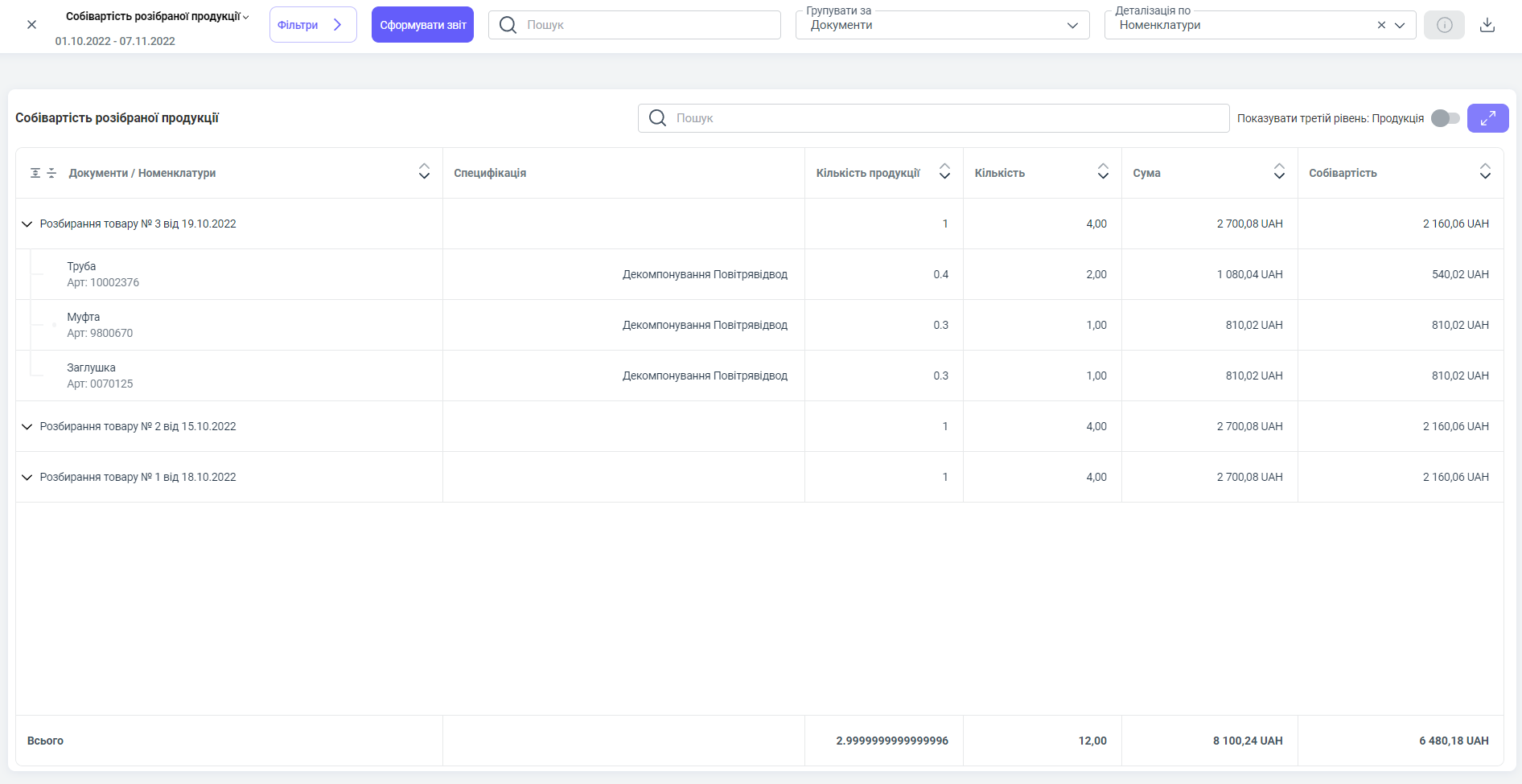 Після створення документа "Виробництво, декомпонування" на основі специфікації дані з цього документу потрапляють у звіт — Собівартість розібраної продукції.