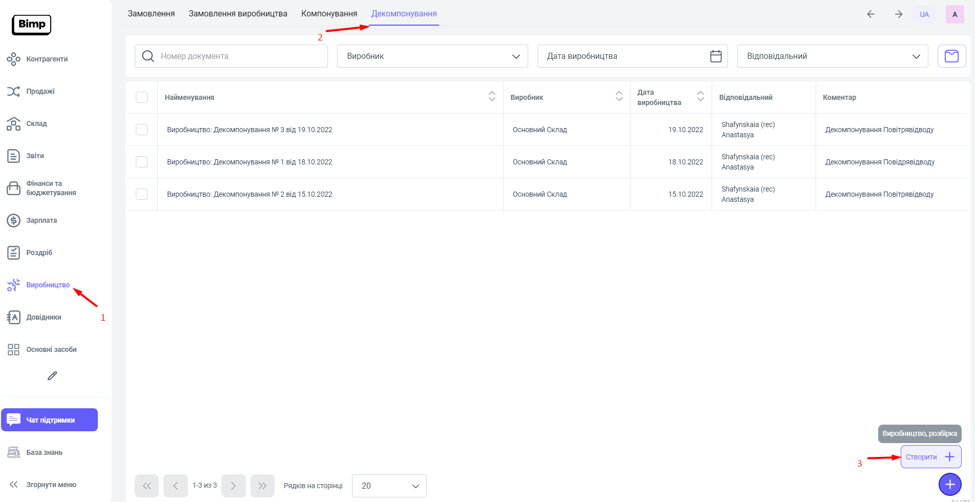 Документ "Виробництво, декомпонування" можна створити в блоці Виробництво розділ Декомпонування, натиснувши на кнопку "Створити".