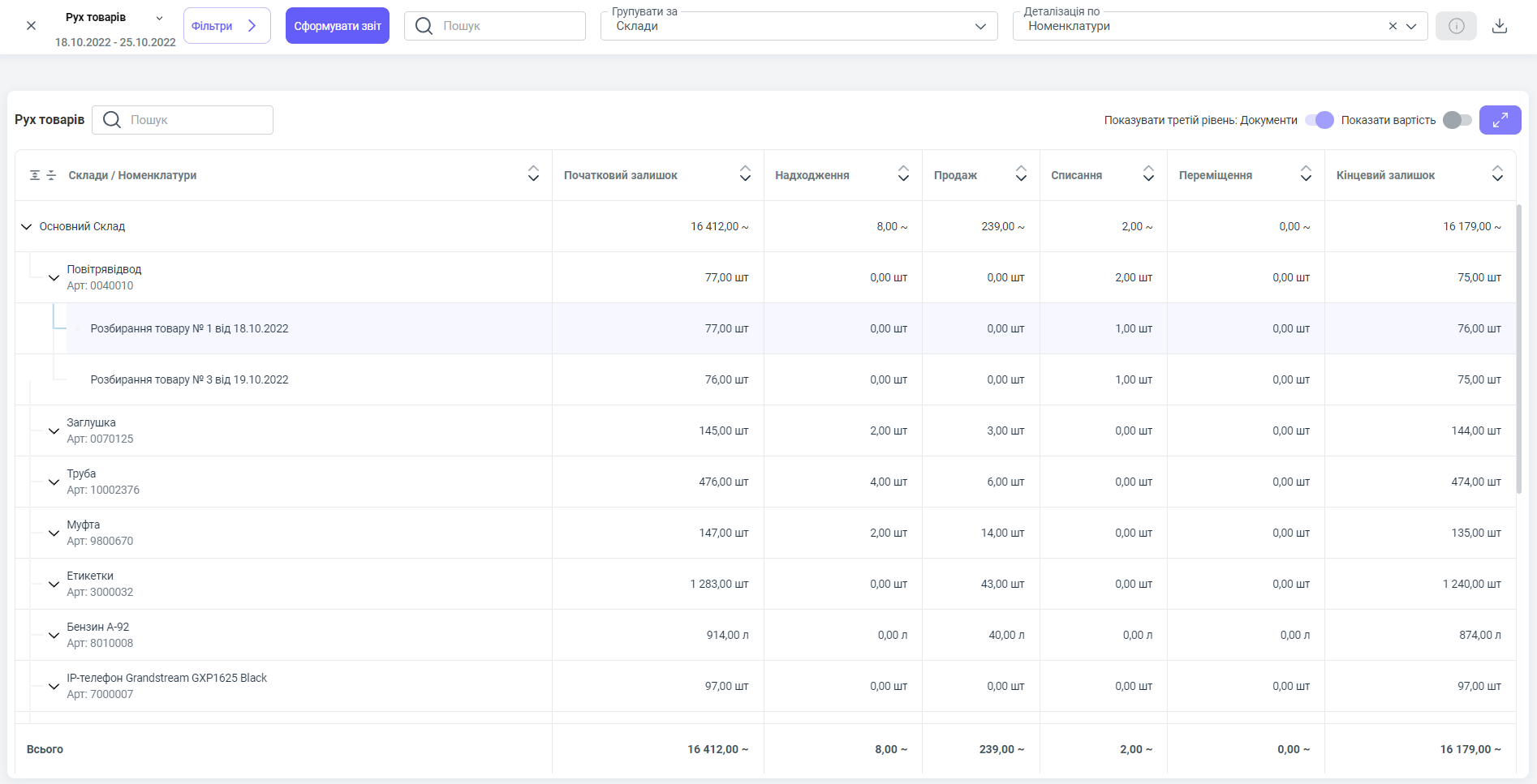 Після створення документа "Виробництво, декомпонування" на основі специфікації, дані з цього документа потрапляють у звіт — Рух товарів.