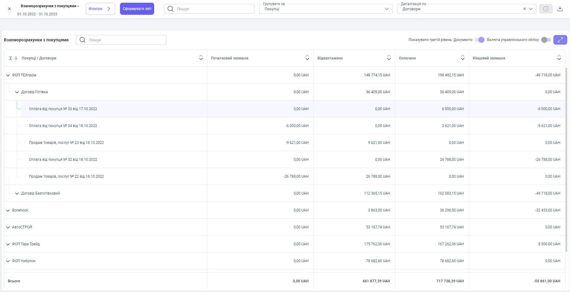 Після проведення на основі рахунку оплати за надані послуги чи реалізований товар, у звіті ми можемо побачити, за яким контрагентом та на яку суму надійшла оплата, а також можемо відстежувати нашу дебіторську заборгованість по кожному покупцю.