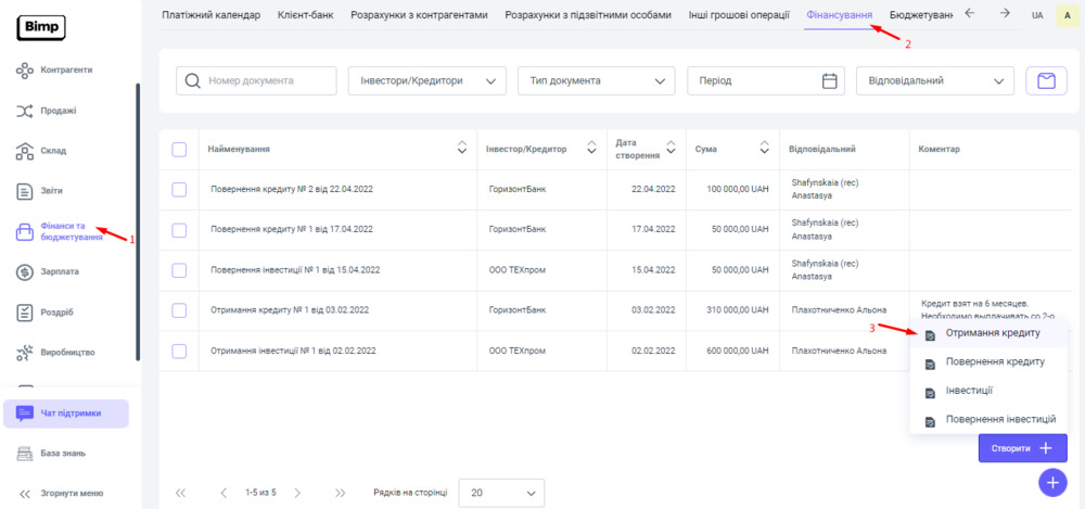 Документ "Отримання кредиту" ви можете створити в блоці Фінанси та бюджетування розділ Фінансування, натиснувши на кнопку "Створити" та обравши рядок Отримання кредиту.