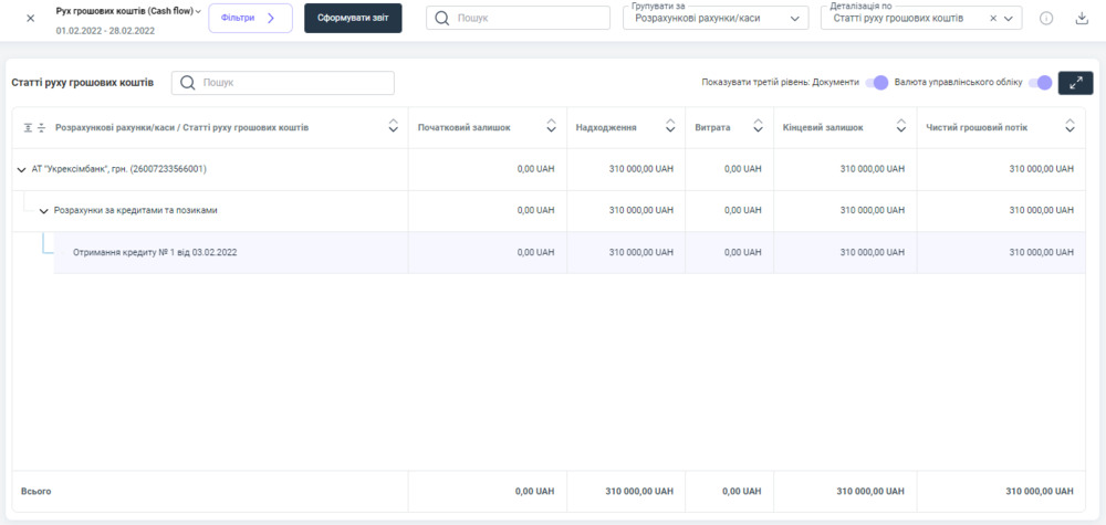 Після створення документа "Отримання кредиту" дані з нього потрапляють у звіт — Рух грошових коштів.