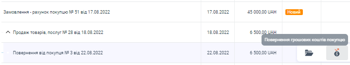 в блоці Продажі розділ Повернення, за допомогою панелі віджетів в рядку необхідного документа "Повернення товару від покупця" натиснувши на віджет "Повернення грошових коштів покупцю".