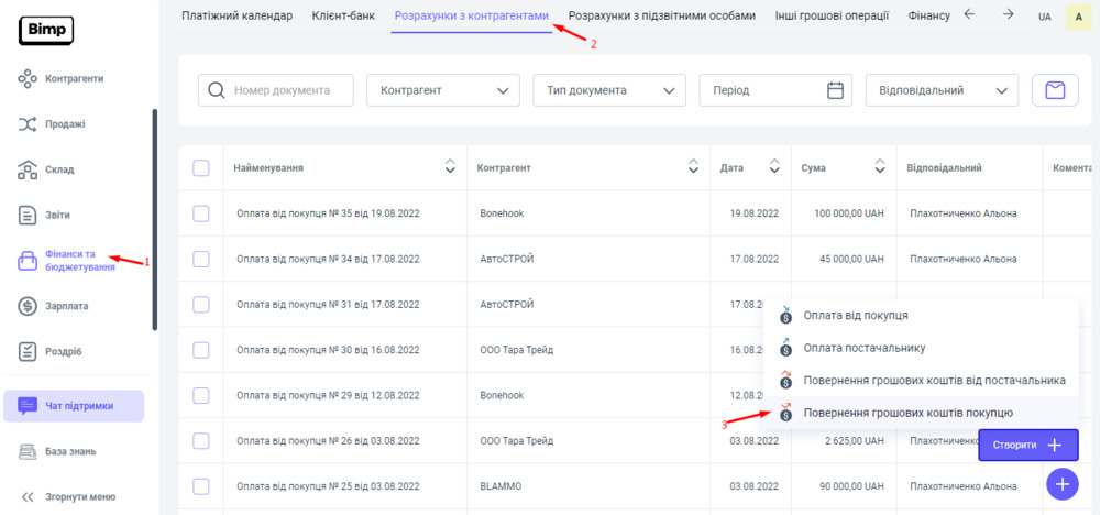 Або, ви можете створити цей документ через блок Фінанси та бюджетування розділ Розрахунки з контрагентами, натиснувши на кнопку "Створити" і обравши рядок Повернення грошових коштів покупцю, а також