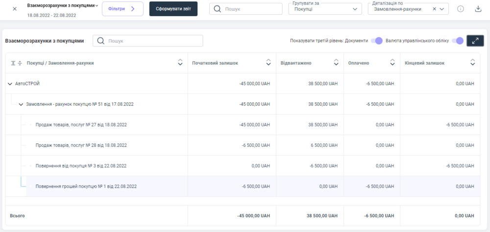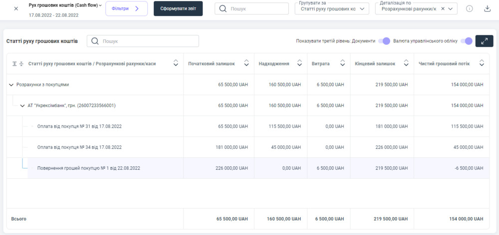 У звіті ми можемо побачити якому контрагенту та яку суму було повернено грошові кошти, а також можемо відстежувати нашу дебіторську заборгованість по кожному покупцю.