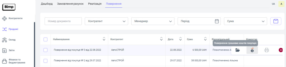 На сервісі Bimp, для того, щоб провести повернення коштів покупцю, необхідно скористатися документом "Повернення грошових коштів покупцю".