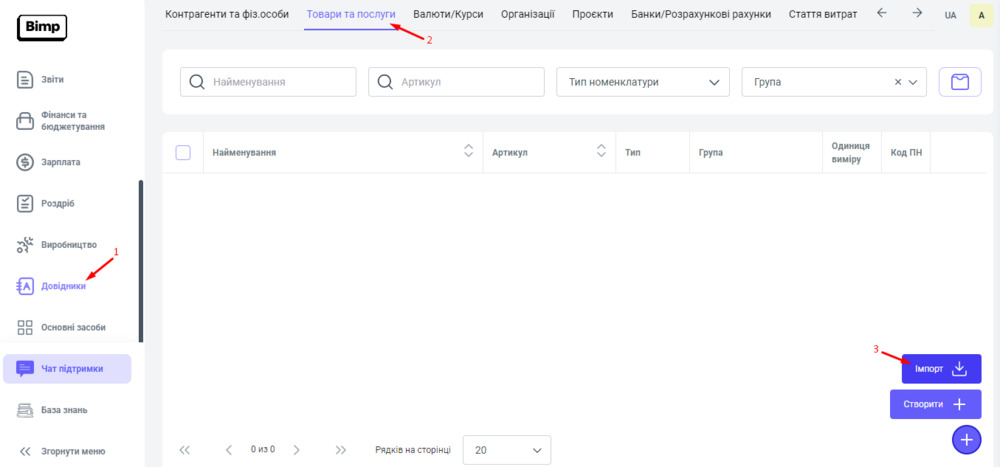Для того, щоб підвантажити шаблон номенклатур, необхідно перейти в блок Довідники, розділ Товари та послуги та натиснути на кнопку "Імпорт".