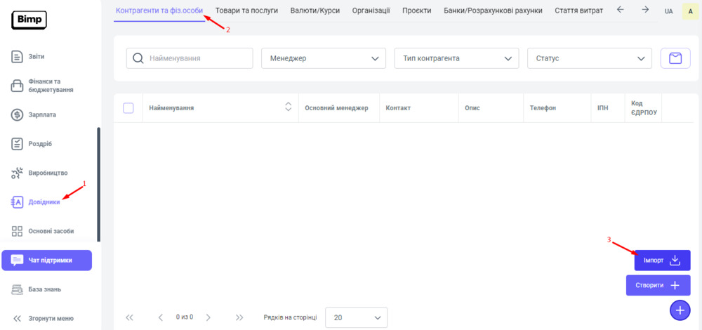 Для того, щоб підвантажити шаблон контрагентів, необхідно перейти в блок Довідники розділ Контрагенти та фізособи та натиснути на кнопку "Імпорт".