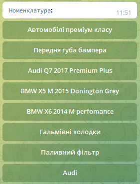 2. Після вибору проєкту з'являється список номенклатур компанії, із котрого ми маємо обрати ту, котру хочемо реалізувати даним рахунком.