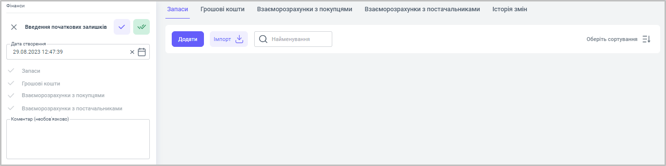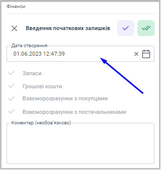 В лівій частині, необхідно вказати Дату створення, а також, за необхідності, залишити коментар для даного документа.
