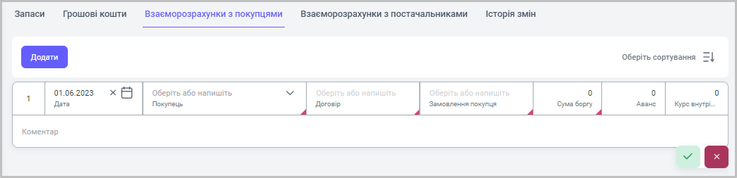 - Покупець — обираємо контрагента за яким вносимо дебіторську заборгованість;