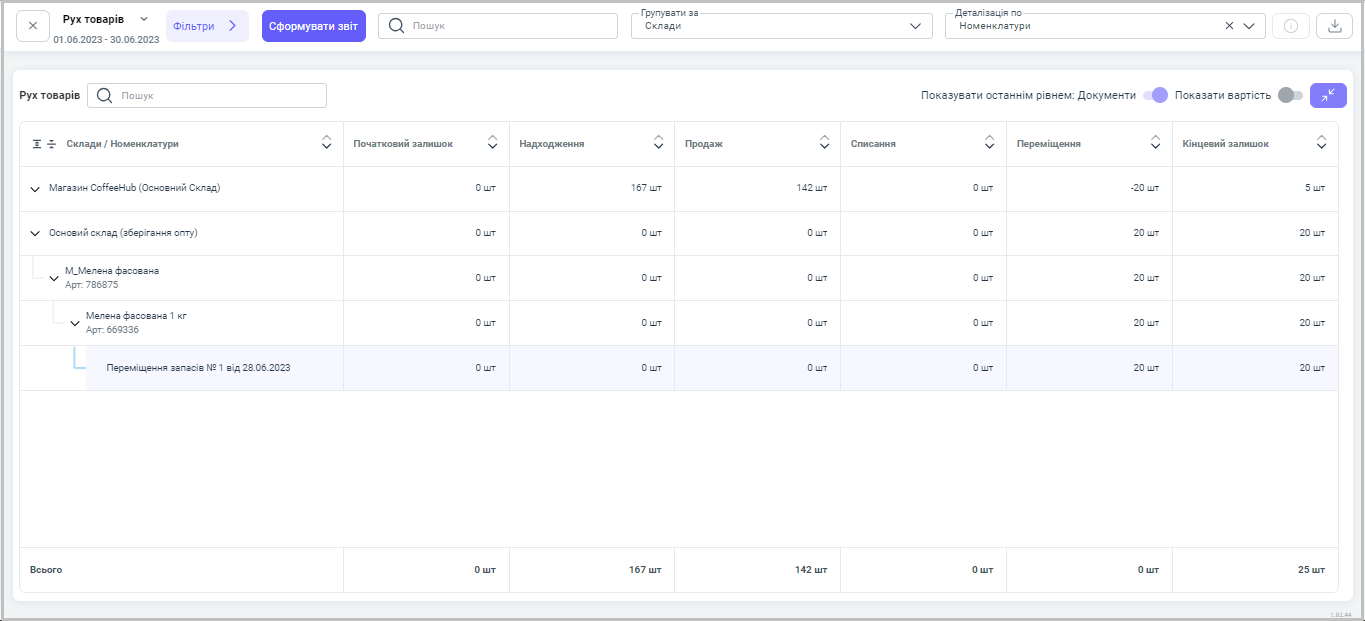 Після створення документа "Переміщення запасів" дані з нього потрапляють у звіт — Рух товарів.