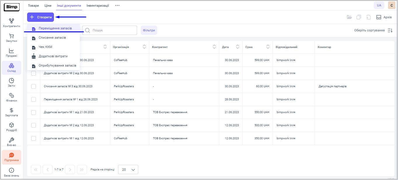 Документ "Переміщення запасів" ви можете створити в блоці Склад розділ Інші документи, натиснувши кнопку "+ Створити" та обравши рядок Переміщення запасів.