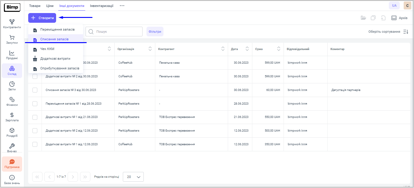 Документ "Списання запасів" ви можете створити в блоці Склад розділі Інші документи, натиснувши на кнопку "+ Створити" і обравши рядок Списання запасів.