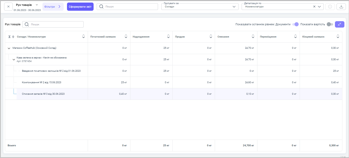У звіті ми можемо побачити з якого складу та скільки одиниць товару було списано за даним документом.