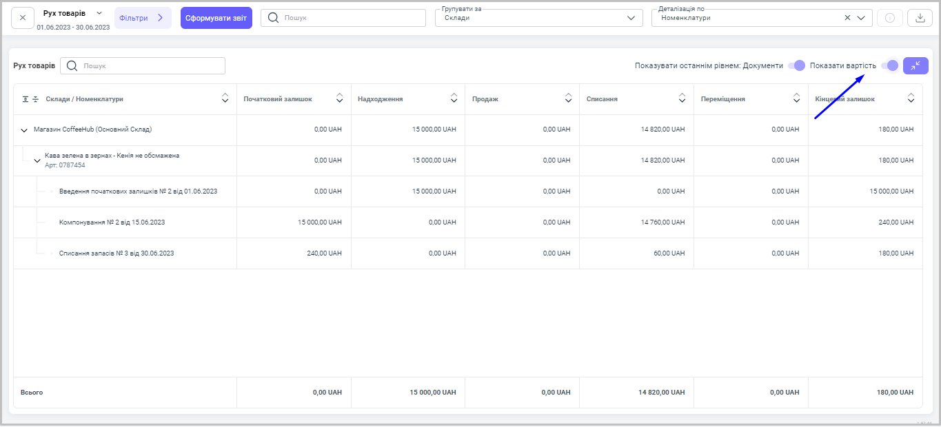 А також, використовуючи перемикач Показати вартість, можемо побачити на яку суму списано товару за даним документом.