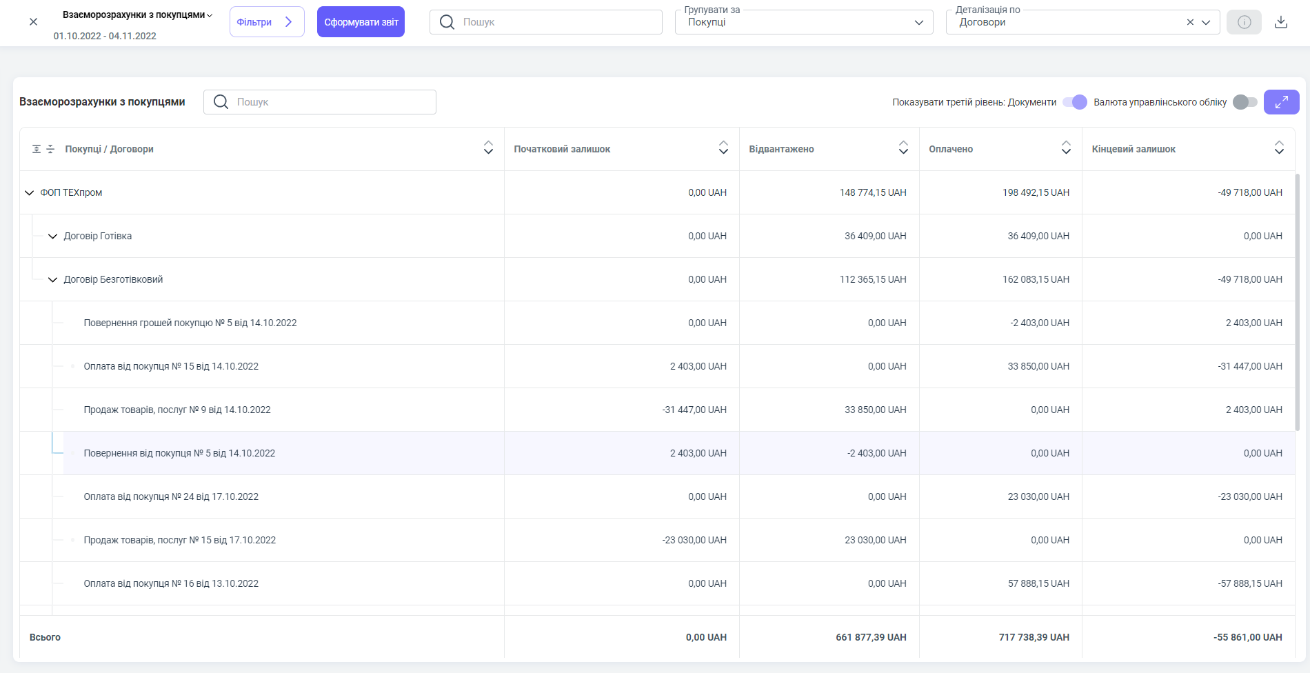 Після створення документа "Повернення товару від покупця", дані з нього потрапляють у звіт - Взаєморозрахунки з покупцями.